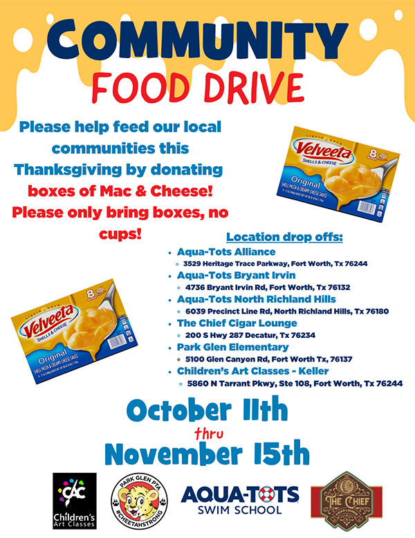 Children’s Art Classes – Keller is partnering with DFW Community Outreach to assist in a food drive to help feed local families in need this Thanksgiving. We are collecting full-size boxes of macaroni and cheese that will be included in turkey baskets being distributed for Thanksgiving.